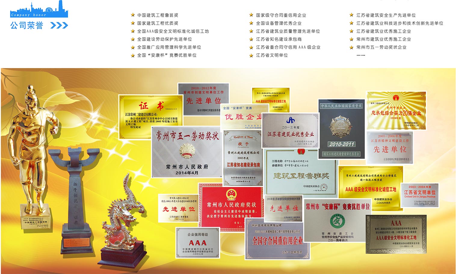 公司六十多年來為常州城市建設(shè)和經(jīng)濟發(fā)展作出了貢獻。在建筑業(yè)改革進程中,公司施工能力和生產(chǎn)規(guī)模得到了進一步發(fā)展,先后承建了常州體育館、常州工業(yè)展覽館、常州大酒店、常州亞細亞影城、中油國際大酒店等一大批有影響的高、大、難項目,并創(chuàng)三十余項省質(zhì)優(yōu)工程和揚子杯獎,多項工程獲國家 級“安康杯”和AAA 級安全文明標準化誠信工地。公司施工的紅梅西村棋區(qū)住宅小區(qū)在早年被評為“魯班獎”工程,常州城市應(yīng)急中心被評為2010—一2011年度常州地區(qū)的我國好的。